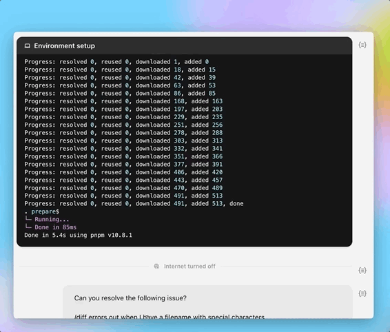 在任务执行期间,互联网访问被禁用,Agent的交互仅限于通过GitHub代码库明确提供的代码以及用户通过安装脚本配置的预安装项。Agent无法访问外部网站、API或其他服务。