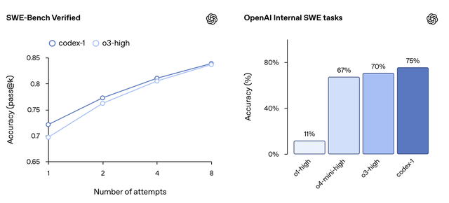 23个无法在OpenAI内部基础架构上运行的SWE-Bench Verified样本被排除在外。codex-1的测试设置最大上下文长度为192k tokens,推理难度为中等,这也是目前产品中可用的设置。